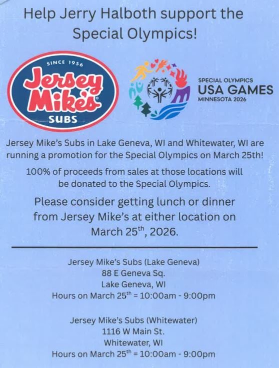 Support Day of Giving and Special Olympics Wisconsin by ordering Jersey Mike’s subs for your team, workplace lunches, or dinner for friends and family on March 25. It’s an easy, meaningful way to enjoy a great meal while directly supporting athletes across Wisconsin and beyond.